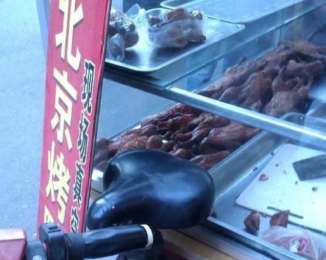 4月8日,記者對北京西站等地的烤鴨市場進行了暗訪。北京西站旁的北蜂窩西路上,一個流動攤販的推車前掛著“北京烤鴨25元/只”的牌子。推車的玻璃柜里陳列著20多個烤好的鴨子,玻璃柜上方還放著已經(jīng)包裝好的“全聚德”和“金聚!钡目绝,旁邊還有幾個全聚德烤鴨的包裝袋。