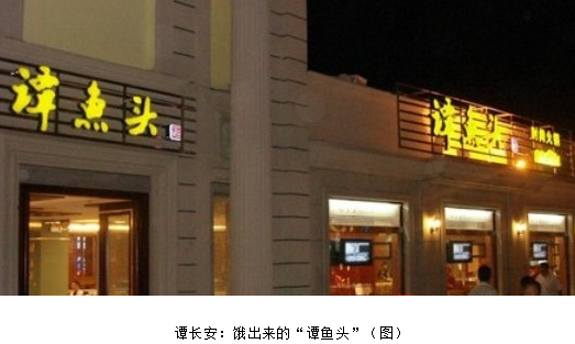 “慢慢的開始有了連鎖經(jīng)營的概念!弊T長安說道,“我認(rèn)為我最成功的地方在于,表面上看‘譚魚頭’是在開店,其實我們是在把無形資產(chǎn)資本化。在北京開店時,我沒出一分錢,我?guī)е业亩拱、找了一幫農(nóng)民娃娃帶到了北京。我建立了一種連鎖加盟的模式,不需要出一分錢就可以占有35%到55%的股份。同時,在一個‘吃味道’的年代,我抓住了機會!