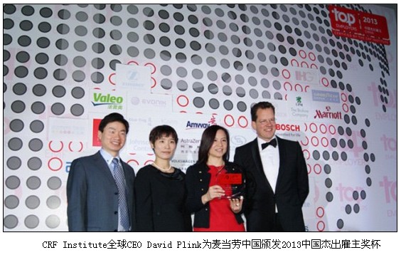 近日,由全球人力資源管理、領(lǐng)導力和戰(zhàn)略領(lǐng)域的知名調(diào)研機構(gòu)CRF Institute舉辦的2013中國杰出雇主頒獎盛典上,麥當勞中國憑借培訓和發(fā)展、職業(yè)發(fā)展和企業(yè)文化管理上的杰出表現(xiàn)從300家公司中脫穎而出,第三次被CRF正式授予“中國杰出雇主”認證。