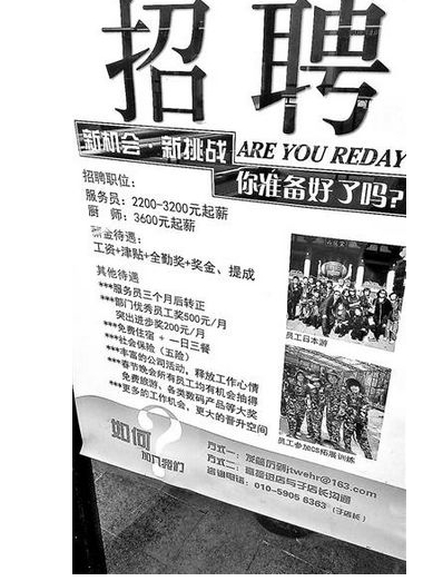 服務(wù)員越來(lái)越緊俏,薪水也水漲船高,福利待遇也成為招聘時(shí)的砝碼。北青報(bào)記者發(fā)現(xiàn),一家大牌連鎖餐飲機(jī)構(gòu)貼出的服務(wù)員招聘廣告上寫(xiě)著:“服務(wù)員起薪2200-3200元,廚師起薪3600元,部門(mén)優(yōu)秀員工月度獎(jiǎng)勵(lì)500元、突出進(jìn)步獎(jiǎng)每月200元,免費(fèi)吃住還有社保!弊钗矍虻氖橇谐隽嗽摴居胸S富活動(dòng),得以令員工釋放工作心情,春節(jié)晚會(huì)所有員工均有機(jī)會(huì)抽到免費(fèi)旅游、各類(lèi)數(shù)碼產(chǎn)品等大獎(jiǎng)。