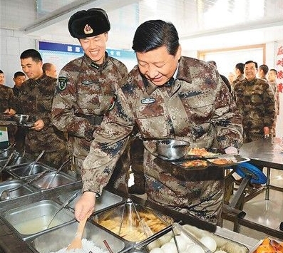 2014年1月26日,習(xí)近平在內(nèi)蒙古軍區(qū)邊防某團(tuán)一連食堂排隊(duì)就餐。