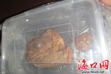 陳先生夫婦到海甸島三東路與人民大道交匯處某茶藝快餐廳就餐時,發(fā)現(xiàn)全熟的牛排肉體內有疑似已經死亡的蟲子類物體,要求餐館負責人與其一道將該食物送到附近醫(yī)院化驗遭拒后,遂向食品藥品監(jiān)督管理部門投訴。今天(11日)上午,美蘭區(qū)食品藥品監(jiān)督管理局執(zhí)法人員對該牛肉食品進行封存送檢。