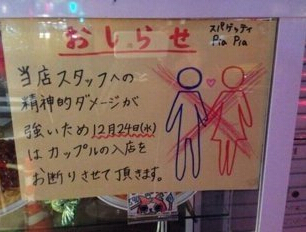 據(jù)香港《文匯報(bào)》12日?qǐng)?bào)道,圣誕節(jié)本應(yīng)普天同慶,但對(duì)單身人士而言,到處都是成雙成對(duì)只能覺得郁悶。日本東京八王子市意式餐廳Pia Pia考慮到在平安夜上班員工的感受,特別在門口貼告示,宣布平安夜當(dāng)日謝絕情侶光顧。