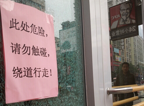 1月7日,記者在肯德基一樓門口看到,一塊鋼化玻璃被擊穿一個(gè)窟窿,整塊玻璃全部碎了,卻沒有掉下來。玻璃上貼了一張警示語:“此處危險(xiǎn),請(qǐng)勿觸碰,繞道行走”。據(jù)一名肯德基員工稱,這塊玻璃可能是由于顧客在玩耍時(shí),不小心碰爛的,事情發(fā)生有一個(gè)多星期了。已經(jīng)訂了新的玻璃,但是還未到貨。