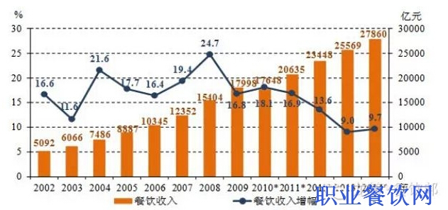 據(jù)國家統(tǒng)計(jì)局最新發(fā)布的數(shù)據(jù)顯示,2014年全國餐飲收入27860億元,同比增長9.7%,比上年加快0.7個(gè)百分點(diǎn),終止了連續(xù)三年增速下滑的頹勢。中國烹飪協(xié)會(huì)會(huì)長姜俊賢表示,按照這一增速,2015年中國餐飲業(yè)將邁入3萬億元新時(shí)代。