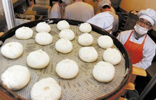 在甘其食,每個人都會看到壘得很高的蒸籠,如果細心一點你會發(fā)現(xiàn),其他包子店,頂多只能壘6層,不是不想多蒸幾籠提高效率,而是再高就熟不了了。甘其食最高能夠達到13層,“從9層到10層再到13層,這個是經(jīng)過了多少次試驗、重新定制蒸鍋等設備才能達到的!蓖瘑⑷A說,不光如此,下面幾層以下只能蒸肉包,中間幾層蒸豆沙包等都是有白紙黑字規(guī)定的,最上面只能蒸青菜香菇包!罢舭邮怯兄v究的,肉是生的,青菜香菇是半熟的,一定要同時熟才行。”
