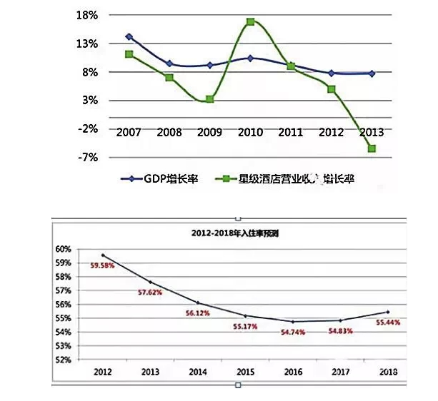盲目超速擴(kuò)容帶來的結(jié)果近年已顯現(xiàn):2014年我國(guó)旅游業(yè)全年總收入約3.25萬億元,這對(duì)于飯店業(yè)來說是一大利好。然而,2011年以后,星級(jí)酒店?duì)I業(yè)增長(zhǎng)速度跑不贏GDP,2013年甚至出現(xiàn)負(fù)增長(zhǎng),這都?xì)w因于供給過剩導(dǎo)致的經(jīng)營(yíng)業(yè)績(jī)下降。