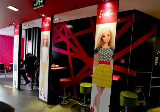 麥當(dāng)勞在北京、廣州、青島、重慶開了多家芭比主題餐廳。店內(nèi)各個(gè)角度都設(shè)有高挑靚麗的芭比人形展板,椅背、墻面也被加上芭比元素,還有放滿整個(gè)櫥窗的迷你芭比娃娃系列,甚至連店員的服裝也是粉色。
