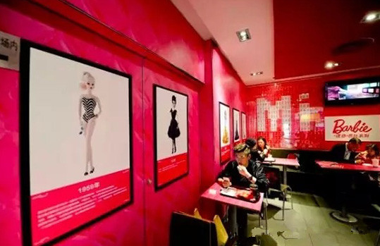 眼下其就在北京、廣州、青島、重慶開了多家芭比主題餐廳。店內(nèi)各個(gè)角度都設(shè)有高挑靚麗的芭比人形展板,椅背、墻面也被加上芭比元素,還有放滿整個(gè)櫥窗的迷你芭比娃娃系列,甚至連店員的服裝也是粉色...