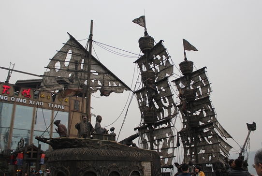 這家火鍋店的負(fù)責(zé)人告訴記者:“除了火鍋口味保證地道與原汁原味之外,我們玩的就是一個電影噱頭!敝貞c是火鍋的重要發(fā)源地,火鍋又包含著重慶的碼頭文化,而電影《加勒比海盜》為觀眾一直熱追,所以設(shè)計(jì)團(tuán)隊(duì)就決定用加勒比海盜船的模型來布置餐廳場景,并以“坐在船上吃火鍋”為餐廳主題。