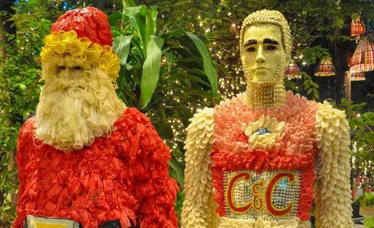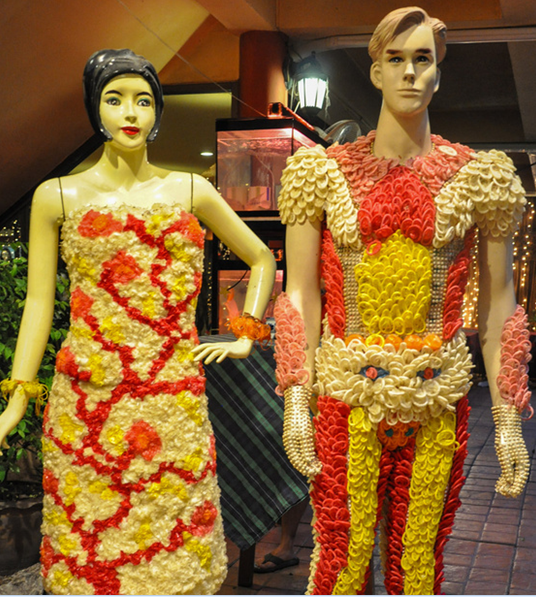 餐廳院子里擺的人形模特讓人眼前一亮,他們都穿著用上萬個避孕套做成的五彩衣服,這樣的配色,這樣的做工恰當?shù)膭倓偤茫瑳]有一絲瑕疵和多余,完全可以稱得上是藝術品。