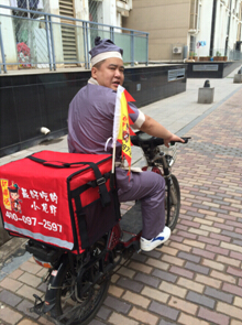 你可以想象這樣一個(gè)場景:車來車往的都市,長安街上,一個(gè)大俠裝扮的古裝小哥騎著電動車風(fēng)馳電掣,一桿杏黃旗上書“蝦鼎記”在車流中隨風(fēng)飄蕩,無數(shù)路人好奇地拿起手機(jī)拍照、發(fā)微博和朋友圈,甚至要求合影。到了客戶家:“大俠您好,我是蝦鼎記神行太!笨蛻艚舆^熱氣騰騰的海鮮,驚喜之余又接過一個(gè)骰盅、四枚骰子,點(diǎn)餐即可獲得一次搖骰子機(jī)會,四個(gè)六免單,四個(gè)六以外點(diǎn)數(shù)相加減掉相應(yīng)錢數(shù)。于是,喜上加喜。
