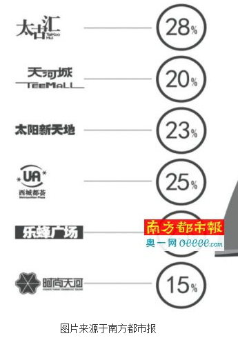 記者粗略統(tǒng)計了一下,按面積規(guī)模統(tǒng)計,正佳廣場的餐飲規(guī)模占比高達(dá)30%,太古匯、西城都薈、樂峰廣場的占比則超過25%;另外天河城、太陽新天地的占比超過20%。