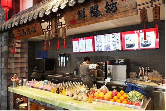 收銀臺(tái)叫錢(qián)莊,飲料區(qū)叫鮮?坊,蘸料區(qū)有官家賣(mài)萌,連員工辦公都在太空艙。