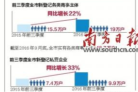 數(shù)據(jù)顯示,前三季度,全市新登記各類商事主體19萬戶,同比增長22%,新登記商事主體增速為近兩年來最高。截至2016年9月底,全市實有各類商事主體146.7萬戶,高出全國平均增速8個百分點!