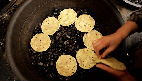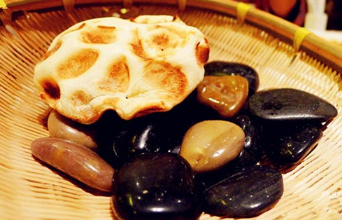 石子饃具有明顯的石器時(shí)代“石烹”遺風(fēng),唐代亦稱“石鏊餅”因其是將餅坯放在燒熱的石子上烙制故而得名,又稱砂子饃。石子饃其歷史源遠(yuǎn)流長(zhǎng),各地都有,晉陜及中原地區(qū)非常流行,石子饃主要原料是面粉、調(diào)味料和動(dòng)植物油,石子饃的餅胚放在一鍋又黑又圓的石子上面,烤出來(lái)的面餅外觀焦黃鮮亮,中凹邊突,咬開(kāi)后層次分明,外酥內(nèi)軟。石烙工藝講究傳熱均勻,火力不能太小或太大。太小則無(wú)焦香味,更無(wú)酥脆的質(zhì)感,太大則外焦而內(nèi)不熟,對(duì)成品外型也會(huì)有很大影響。由于石頭本身是熱的良導(dǎo)體,傳熱均勻迅速,使烹調(diào)時(shí)間得以有效地縮短。在生產(chǎn)資料極端匱乏的古代,采用石烹技法是個(gè)聰明又健康的方法。
