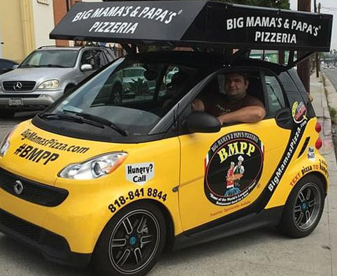 Big Mama‘s&Papa’s曾使用傳統(tǒng)的貨車來運(yùn)送巨型披薩,但如今它已經(jīng)擁有了專門的定制車輛。車身為黃色和黑色,印有連鎖店的電話號碼和網(wǎng)站名稱,某些部位還寫有“Big Mama&Papa‘s”的標(biāo)志。最引人注目的是車頂上安裝著巨大的收納箱,運(yùn)送期間可以放置巨型比薩。